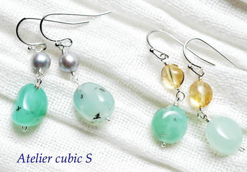 クリソプレーズは色の薄いものから濃い緑まである石です。せっかくの個性なので、ピアスの左右の色を異なる組み合わせにしました。
