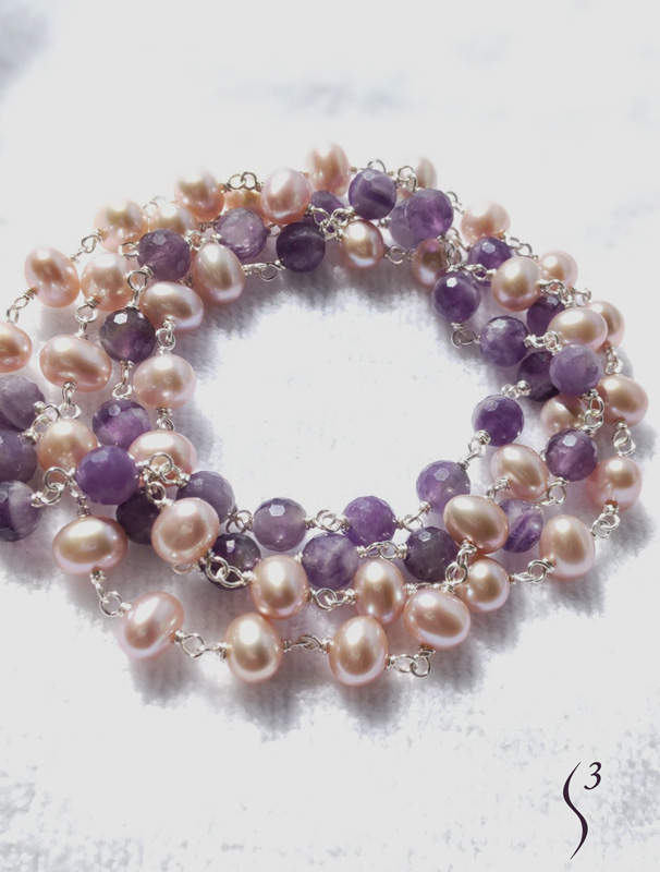 縞のあるアメジストと艶々の淡水パール のロングネックレス約85cm