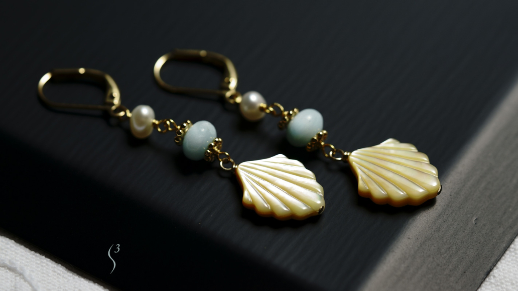 夏の海→人魚→人魚の耳飾り と言う、私だけの連想で制作を開始。人魚が着けていそうな耳飾りってどんなん?海の中を想像して、人魚が入手できる素材で作るのが自然なぁと思いました。