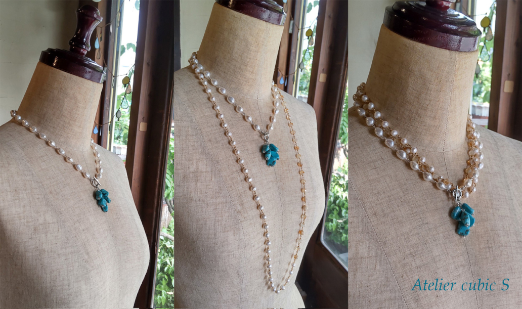 追加した新作の ターコイズ と淡水パール のネックレス(写真左)