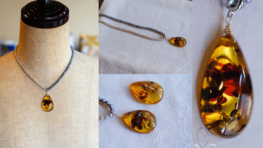 琥珀(バルティックアンバー)のトップに2色のグレーの淡水パールネック。大粒のライトブラウンの中にダークカラーの内包物が立体的に入っています。自分では撮れなかったこの立体感。やっぱり極めた人は凄い。尊敬と感謝。