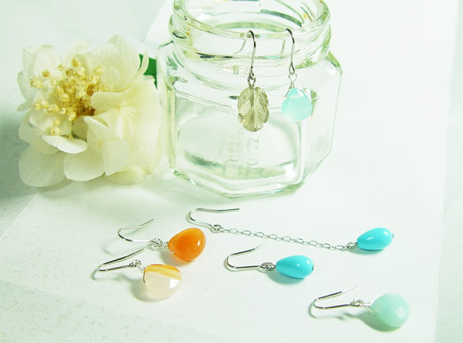 大阪市谷町六丁目のひなたさんに期間限定で置いて頂いているピアスツリー。お陰様で好評です。季節的なこともあってかブルーのカルセドニーが特に減り、全体の色のバランスが崩れてきました。というわけで、本日は追加に行ってきました。当初から人気のカルセドニーやさんごの追加はもちろん、新しく写真の石達が仲間入りです。左手前の2つのオレンジはカーネリアン。前からあるものよりもひと周り小さいタイプです。右手前のマロン形はアマゾナイト。真ん中がターコイズ。これはターコイズの粉をかためた物ですが、ドイツ製のちょっと良いものですよ。すっきりとしたスカイブルーで夏らしい色です。ビンにかかっているのは左が葉っぱの形のスモーキークオーツ。右がカルセドニー。このカルセドニーは少し緑がかった柔らかいブルーです。