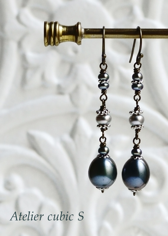 ピアス金具やワイヤーはアンティークゴールド、パールに添えた金具は銀色。この色あわせが大好きで、定期的に登場します。