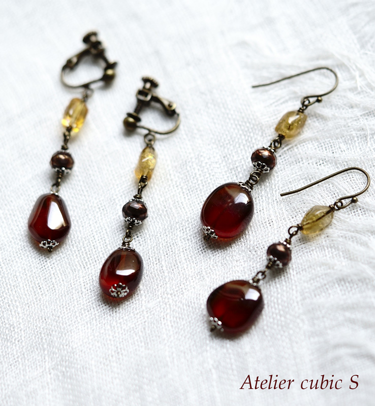 今回の個展では赤と茶色を多用しています。意識せずに制作した結果なのでたぶんこの2色に夢中なのだと思います。この耳飾りはその代表選手。