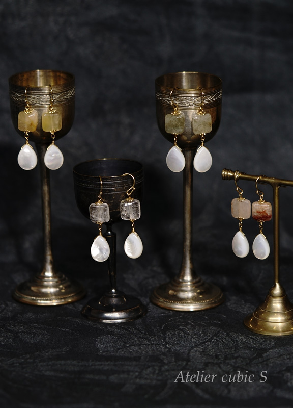 以前にも他の石で作った「四角の下にしずくの形」。収まり感と外し感のバランスが気に入っています。他の組み合わせも検討中です。