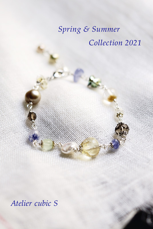 スモーキークォーツや淡水パールは複数使っていますが、大きさや形・色などが異なります。他の素材も透明感がある物や無いもの、目立ちやすいものそうでないものなどをMIXしました。「ひとつひとつはバラバラだけど、まとまると相乗効果で世界観が生まれる」みたいなものを作りたかったんです。