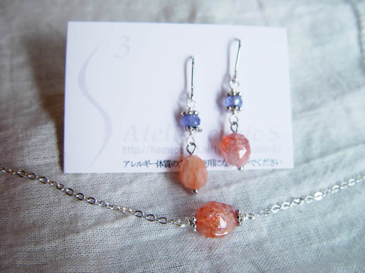 写真はサンストーンのネックレスと、サンストーン&タンザナイトのピアス。
