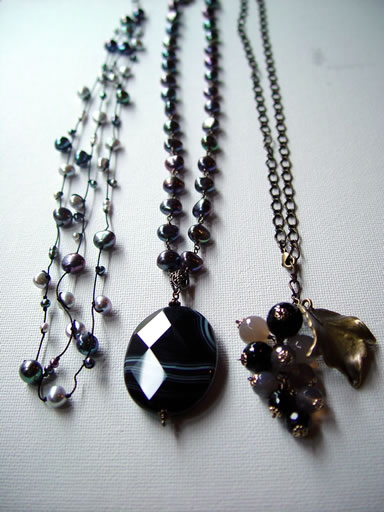 左が定番の淡水パールとシルク糸のネックレス、ブラックバージョン