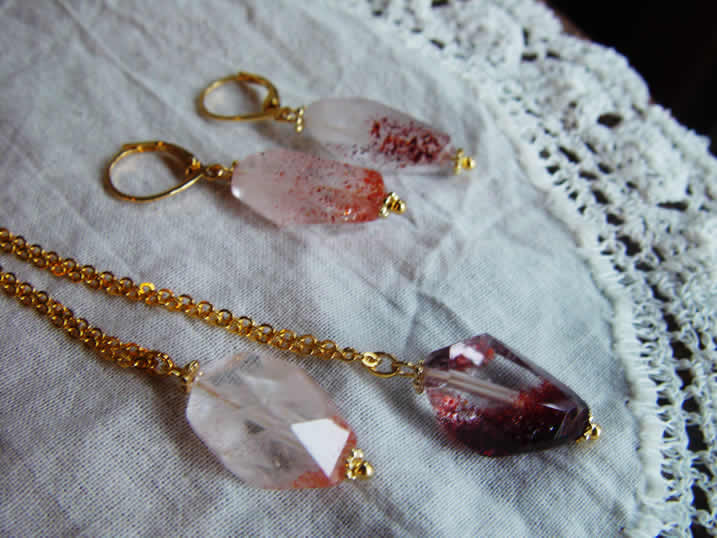 写真はレピドクロサイトインクオーツのネックレスとピアス。追加制作したものです。