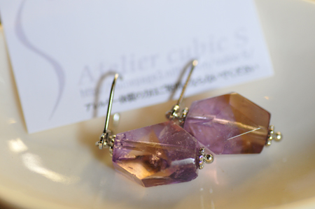 写真はアメトリンのピアス。アメジストの紫とシトリンの黄色がバイカラーとなっています。今回入手できたこのアメトリン、こんなにはっきりとバイカラーが確認できる物なのに、私でも買えるお手頃なお値段だったので仕入れました。今後もこんな出会いがあるといいなぁ。