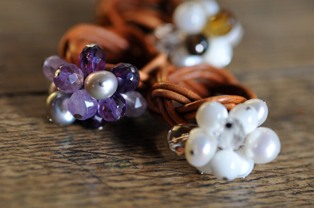 中央の紫のリングが新色。アメジストと淡水パールです。もちろんリングの部分はいつもの手編み。一本のレザーを編んでいます。