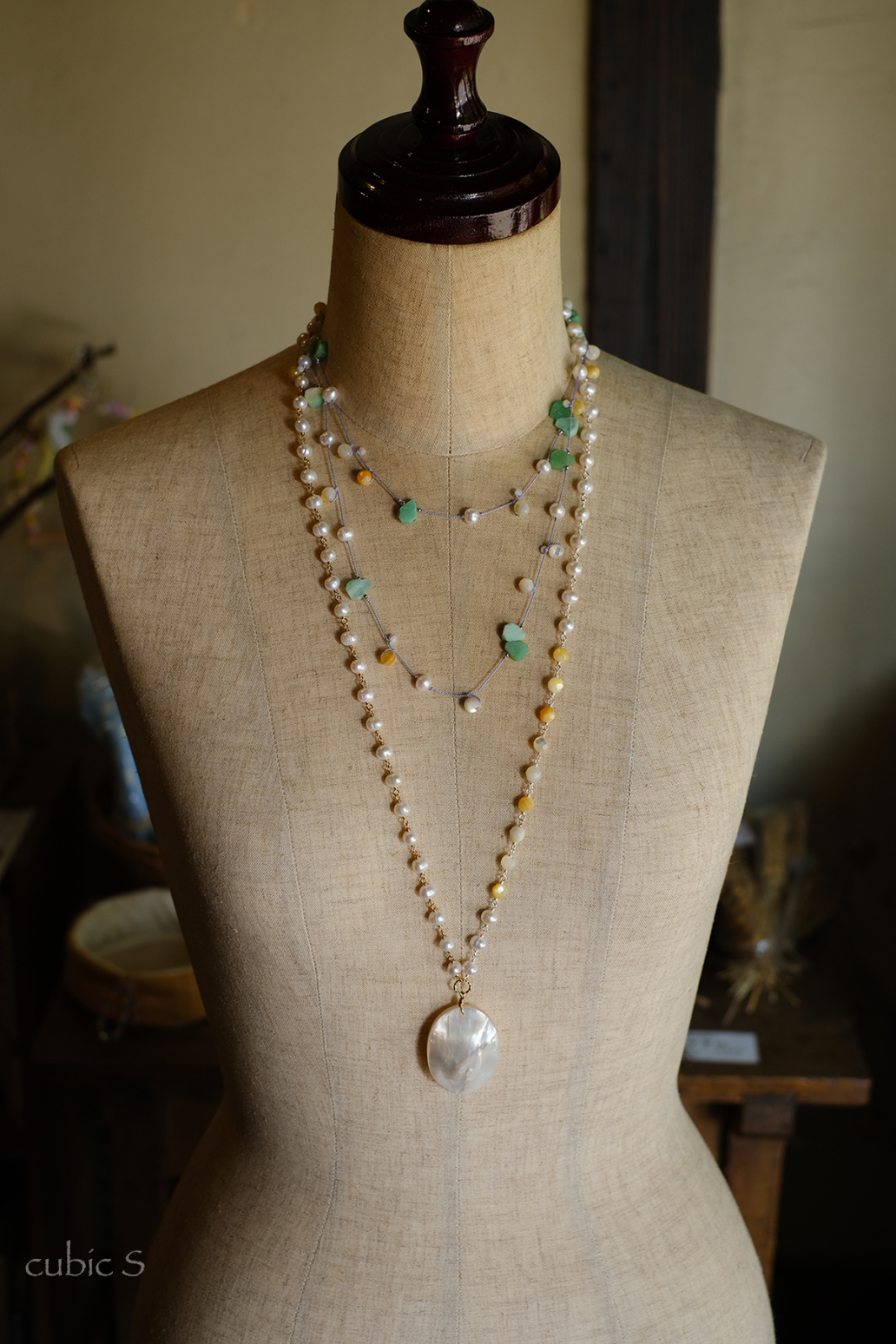・クリソプレーズとシェルやパールをシルク糸で留め付けたネックレス
