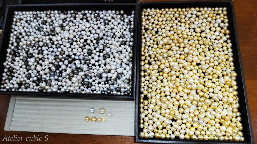 1つ前の日記でご紹介した南洋真珠のピンブローチ。それに使用した真珠を卸屋さんで選んでいるところです。キラキラを見つめて見つめてコロコロ転がして転がして…目を閉じても残像現象で真珠が見えるほどの見つめようです。