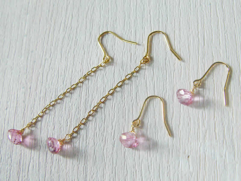 写真は500円ピアスツリーの「ピンクトパーズ」です。これは透明なトパーズの表面に金属を蒸着しています。