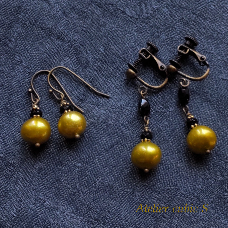 真珠卸屋さんでは「グリーン」でカテゴライズされがちなカラーですが、個人的には真鍮色や金色チームだと思っています。黒との相性の良さが際立つようシンプルに。