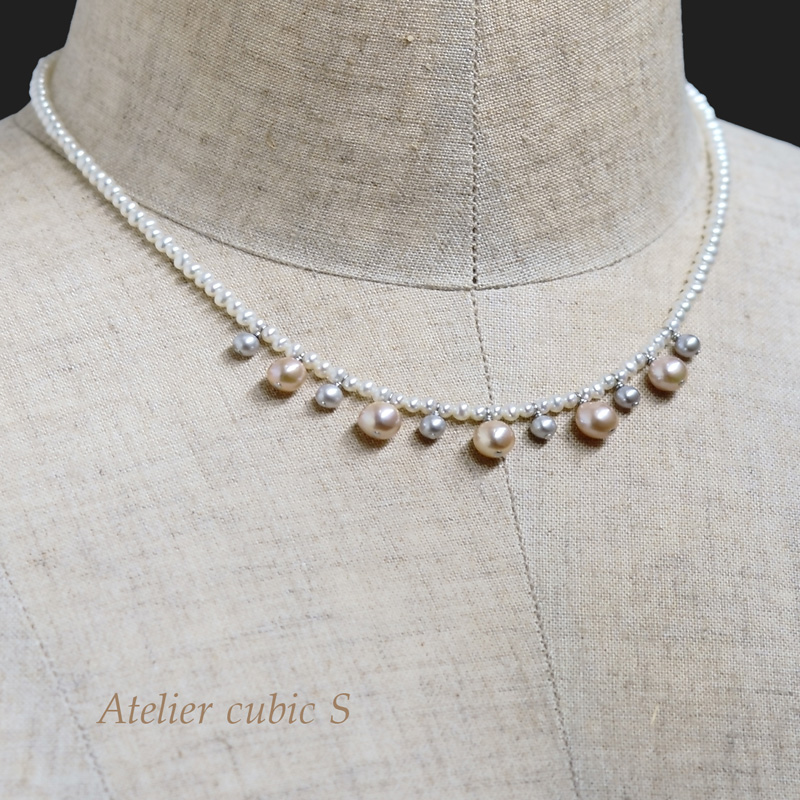 チェーン部分の白いパールは、いまは入手困難なサイズと色。生産量が減っているのに需要が爆上がり中の小粒白ですが、cubic Sには関係ありません。自家製のデットストックがあります。と言いながら、そろそろ足りなくなってきて焦りだしております。でもしかし、パールは養殖できるのです。きっとあと数年経てばこの高騰も落ち着くはず…うまく乗り切れるようにがんばります。
