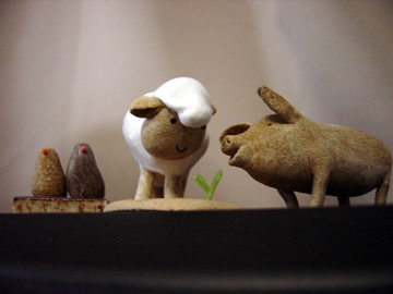 私はあまり置物を買いません。なのにどうしても欲しくて買ったのがこの子達です。yochi-kichiさんという作家さんの作品です。かわいい・・・。首のかしげ方がなんとも言えません。ほっこり癒されます。普段からひなたさんで販売しておられますが、12月に個展をされた時はいつもとは比べものにならないほどたくさん並んでいました。期間中2回も行ってしまうほどとりこです。yochi-kichiさんともお話しできたし、楽しかったぁ。(その時写真をサイトに載せることを快諾いただけたんですよ)ひよこや亀、ペンギン、サル、犬、猫、どれもほんわかしていて心が満タンになりました。個展では結局悩みに悩んでひつじとぶたを連れて帰りました。おかげで毎日癒されています。