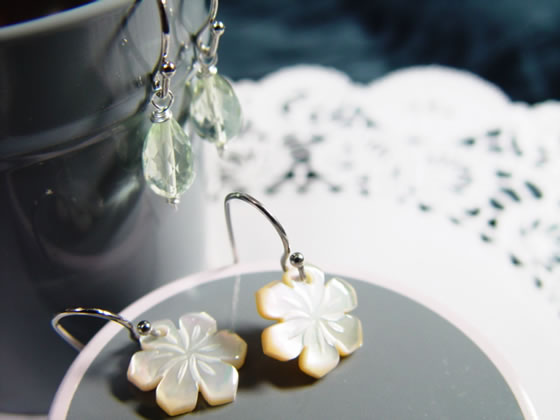 今回特におすすめの作品は写真のピアスです。白い方が花のカービングが可愛らしいシェルです。もう一つが、グリーンアメジスト。