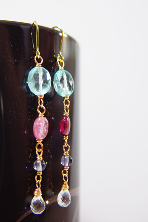 11月の誕生石をあーとぼっくすへ納品しました。今月はトパーズのイヤリング&ピアスです。昨年に引き続きトパーズと他の石の組み合わせですよ。昨年との違いは「華やか」か「渋いか」ですね。金具も思い切って金色に。上からブルートパーズ・ピンクトルマリン・アイオライト・ホワイトトパーズ。ブルートパーズはカットも美しく水色らしい水色です。ピンクトルマリンは左右で色の濃さを変えてみました。デザインを考えている時にどちらにするかさんざん迷って、結局どちらも捨てがたいということでこうなりました。みなさんはどちらがお好みですか?ホワイトトパーズは昨年も使用したカットの良いきれいなしずくです。見た目は水晶と変わりありませんが、お値段はかなり違います。正直、誕生石シリーズでなければ水晶を使うところだなぁ。そういったところも含めて楽しんでいただけると幸いです。